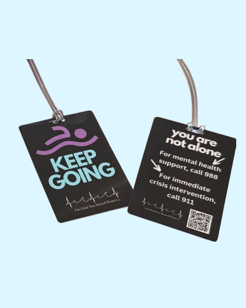 These bracelets have the words “Just Keep Swimming”, the suicide & crisis lifeline 988 number, and IGYSP (I’m Glad You Stayed Project).